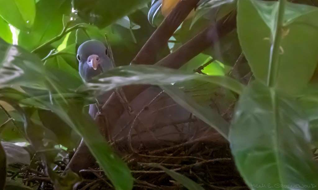 Nestfotografie geeft verstoring. Maar wat dan met dat nest van die houtduiven? Die suffe dieren zoeken de verstoring zelf op, hebben het in hun kleine koppie gehaald om pal achter mijn keukendeur te gaan nestelen. Als ik de deur stevig open doe, krijgt moeder in haar nest een optater. Ik heb me maar aangeleerd om héél voorzichtig en rustig pratend de keukendeur op een kier te zetten en naar buiten te glippen. Het verhaal dat ik mijzelf daar vertel is dat de dieren mij wel aardig vinden, anders zouden ze zo’n plek toch niet uitzoeken. Op de foto lijkt ze argwanend in de lens te kijken, maar ze zat zich rustig te poetsen, schikte nog een takje, en ging even verzitten. Ik denk zomaar dat haar eieren in deze hitte zijn uitgekomen, want er lag een donsveertje met wat bloed op de grond.