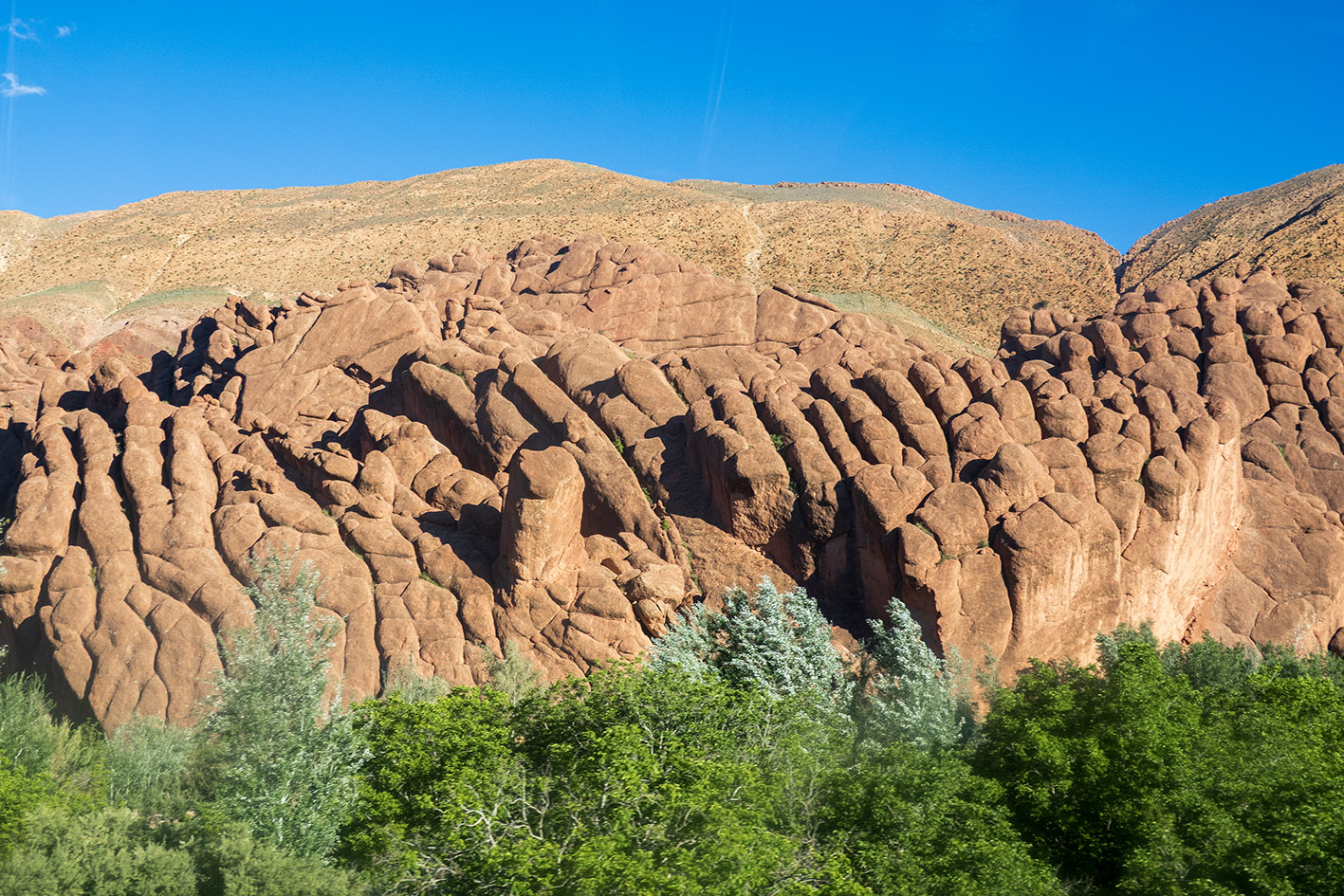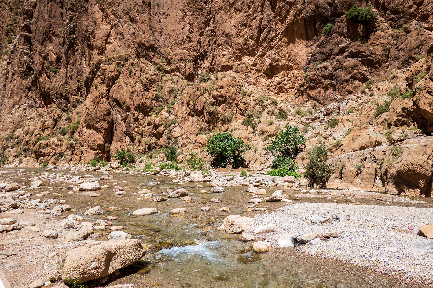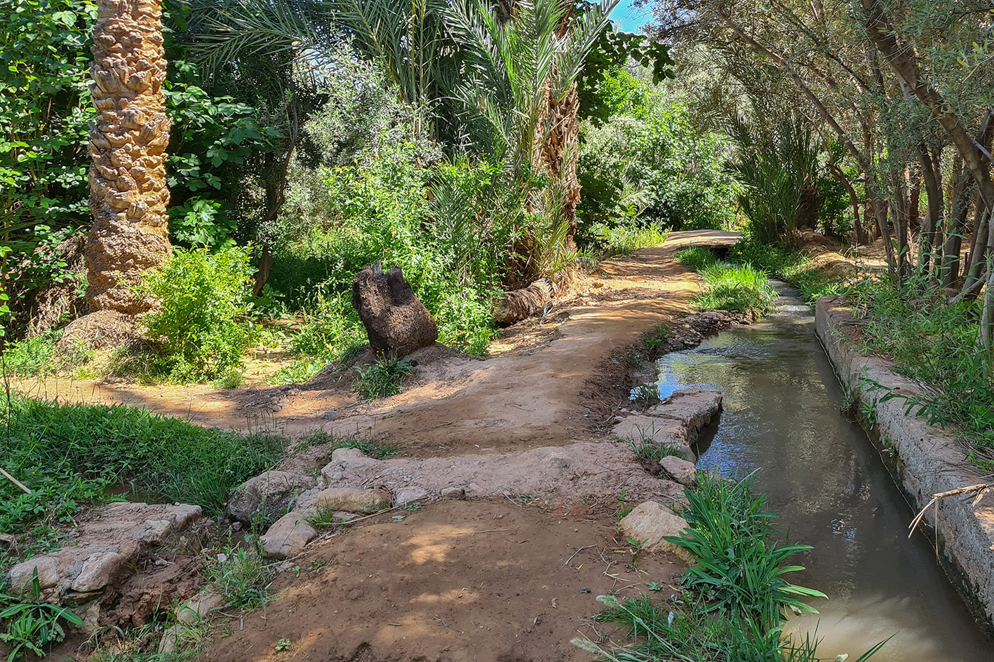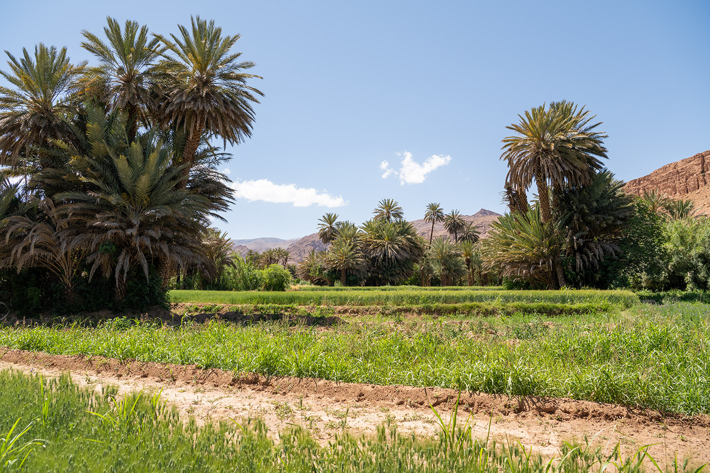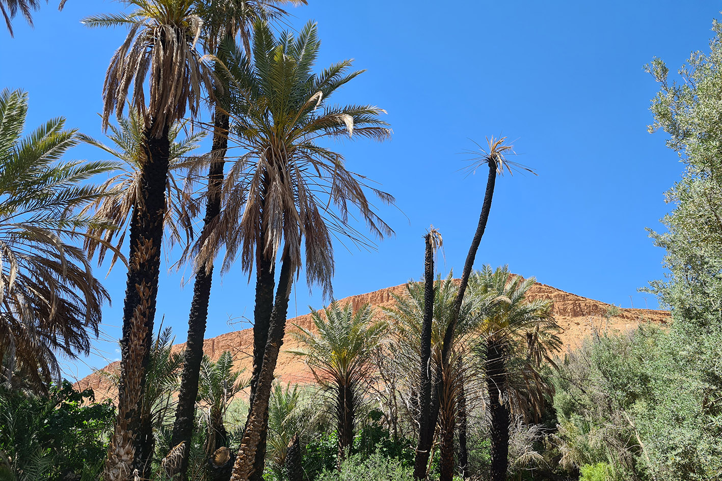 De rivier Dadès brengt water en vruchtbare aarde in het verder dorre landschap. Let op de verbrande palmen: zodra er termieten worden gezien in een boom, wordt de boom verbrand in de hoop de termieten te doden, maar de palm en het hout intact te laten