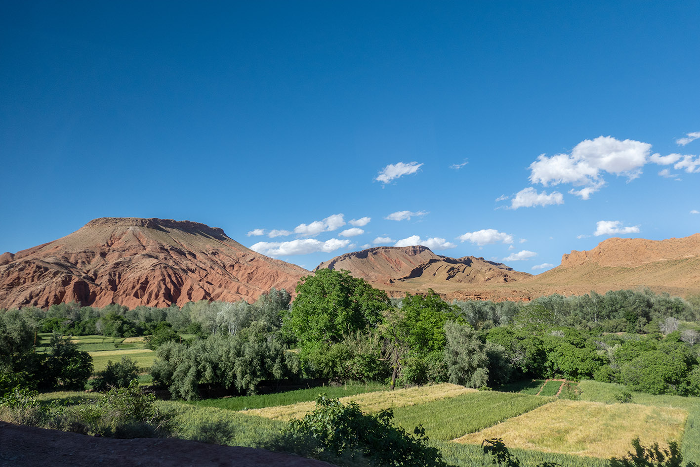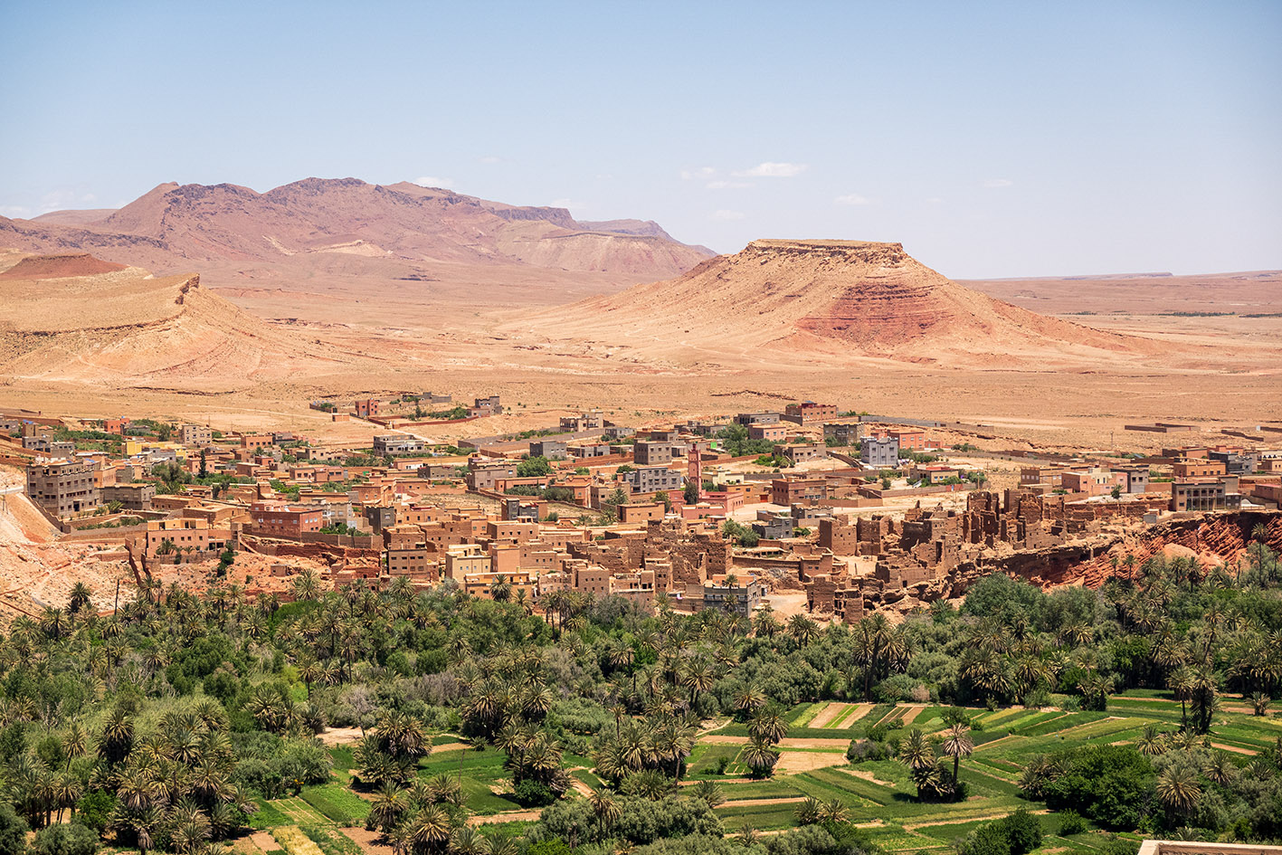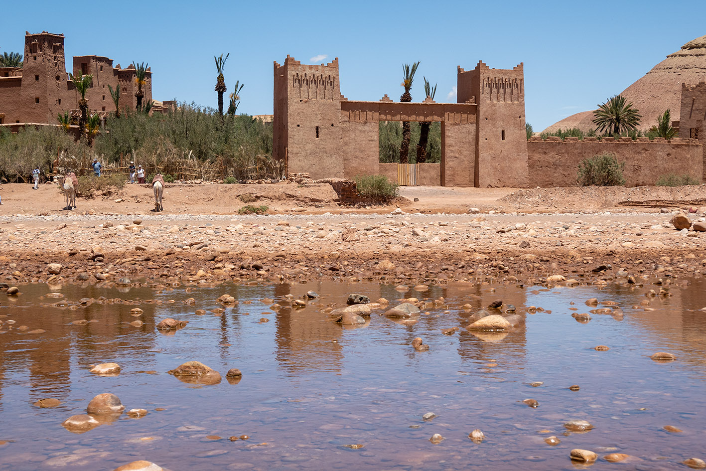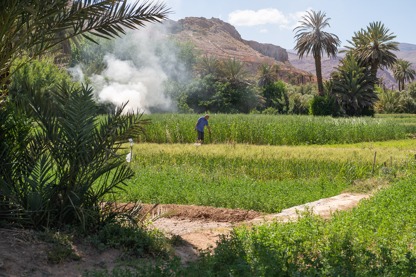De rivier Dadès brengt water en vruchtbare aarde in het verder dorre landschap. Let op de verbrande palmen: zodra er termieten worden gezien in een boom, wordt de boom verbrand in de hoop de termieten te doden, maar de palm en het hout intact te laten