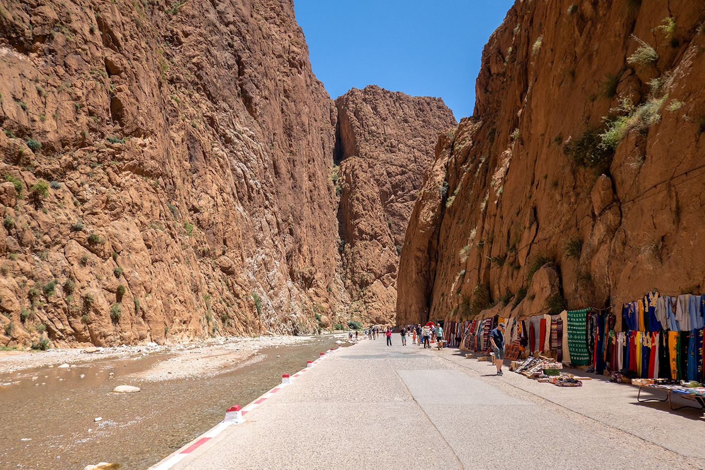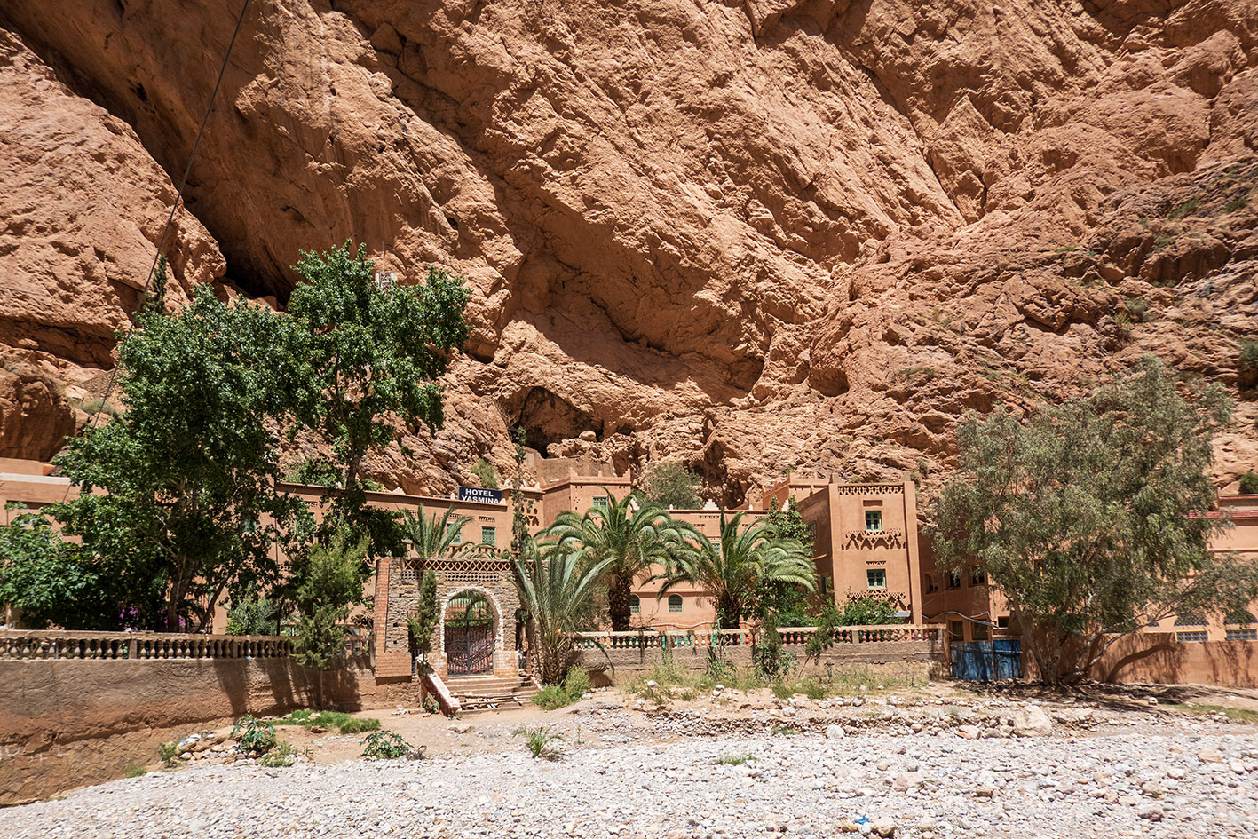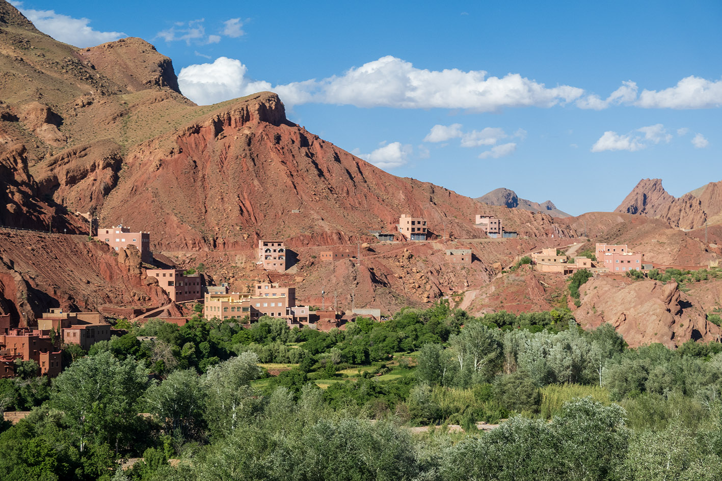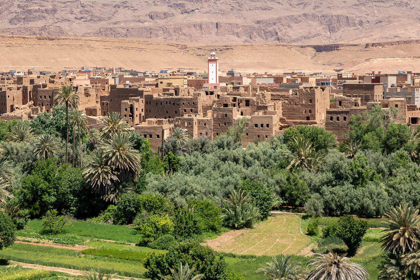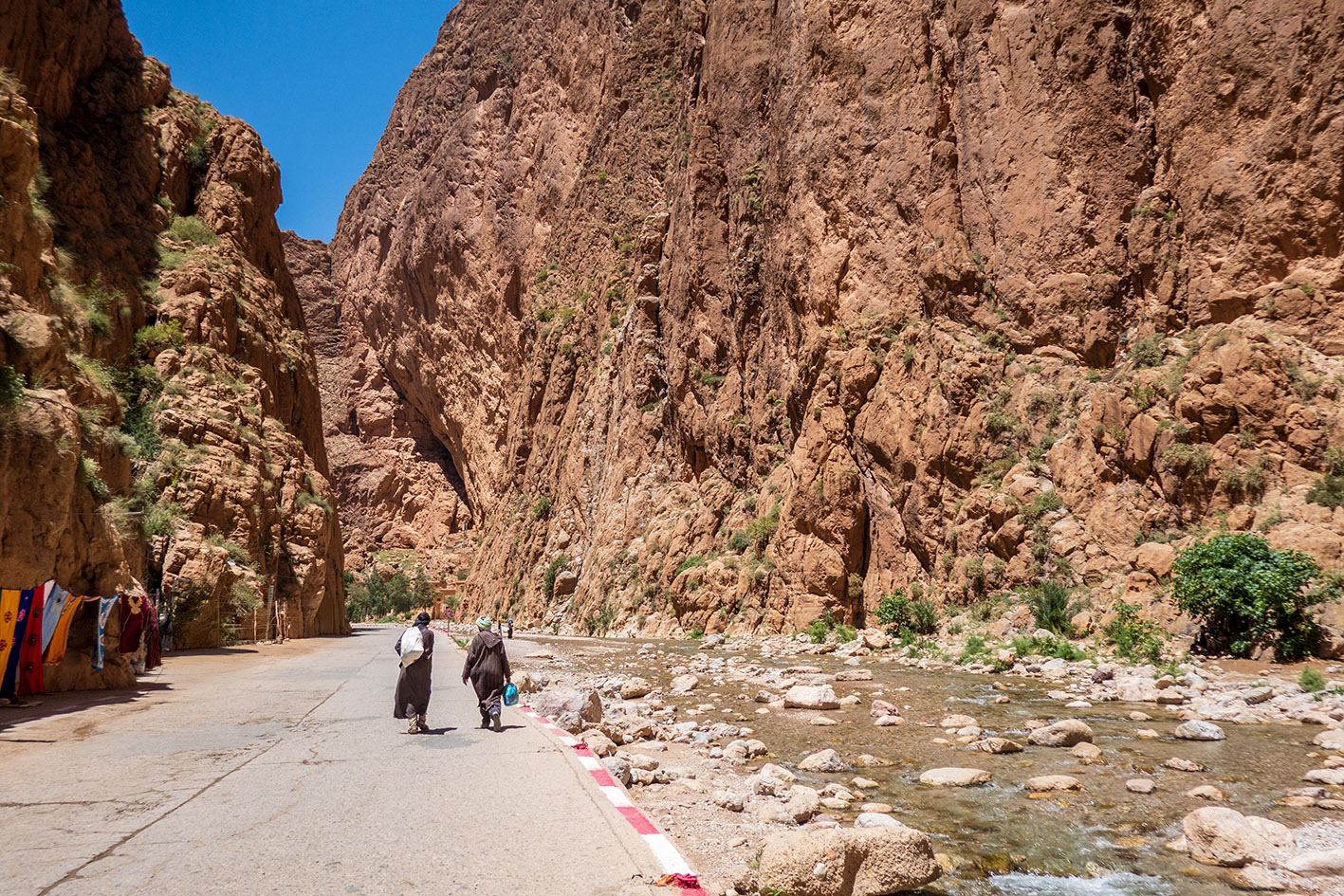 De rivier Dadès brengt water en vruchtbare aarde in het verder dorre landschap. Let op de verbrande palmen: zodra er termieten worden gezien in een boom, wordt de boom verbrand in de hoop de termieten te doden, maar de palm en het hout intact te laten