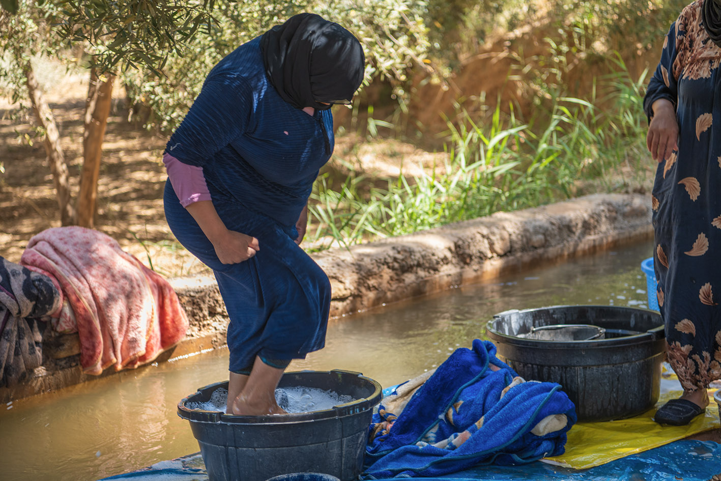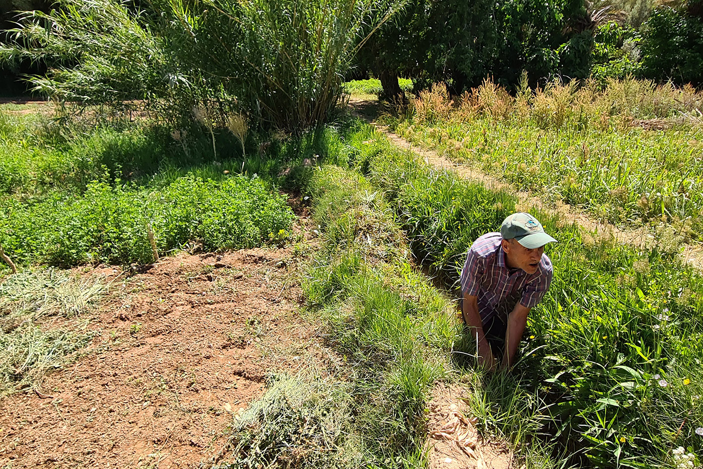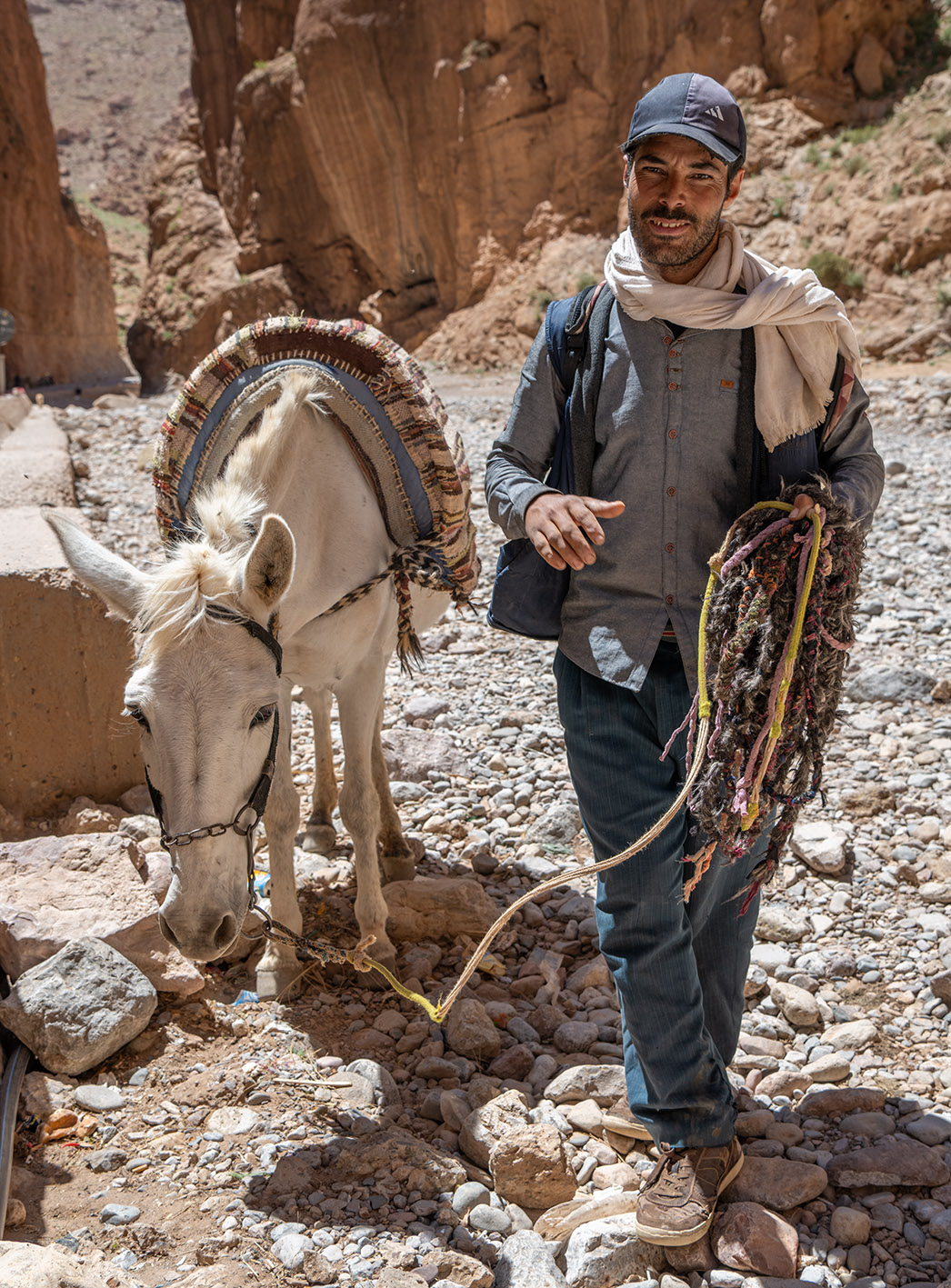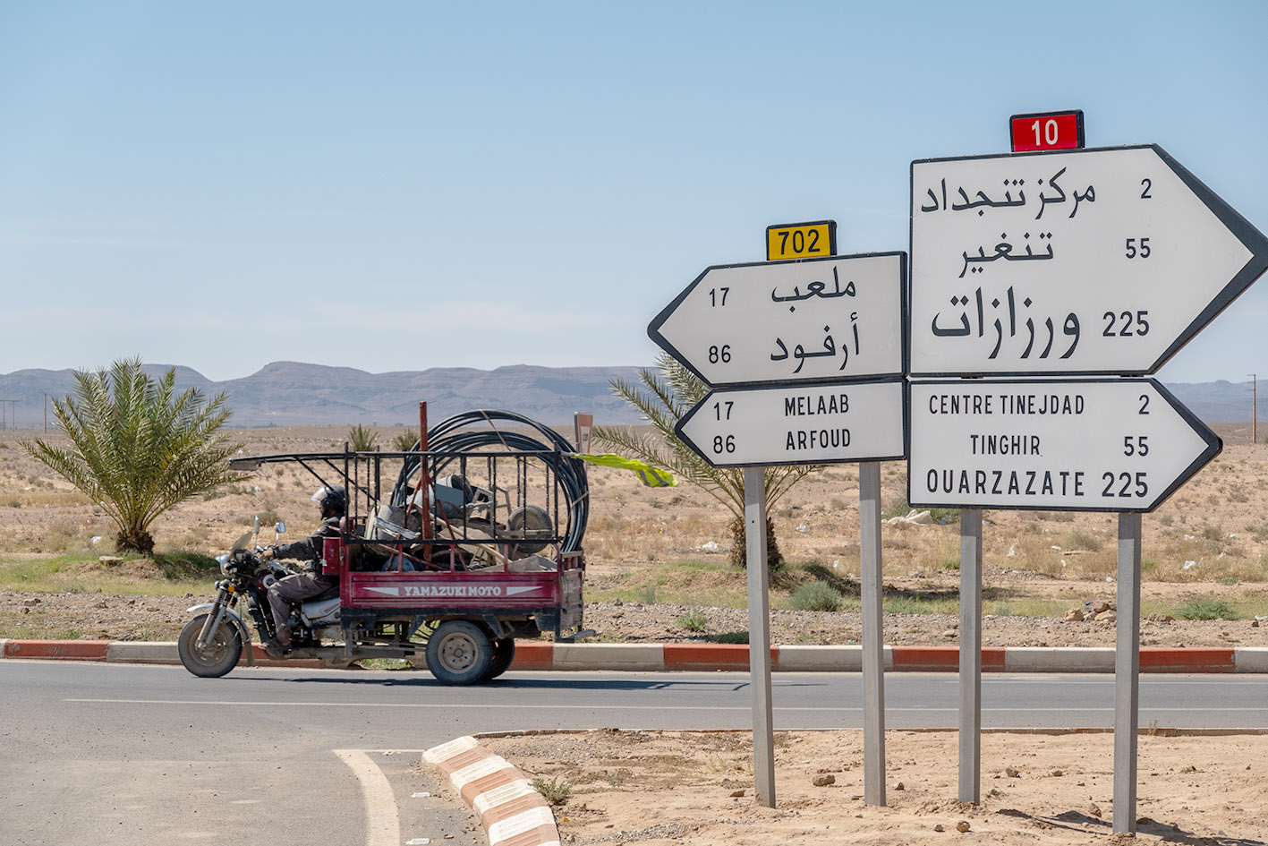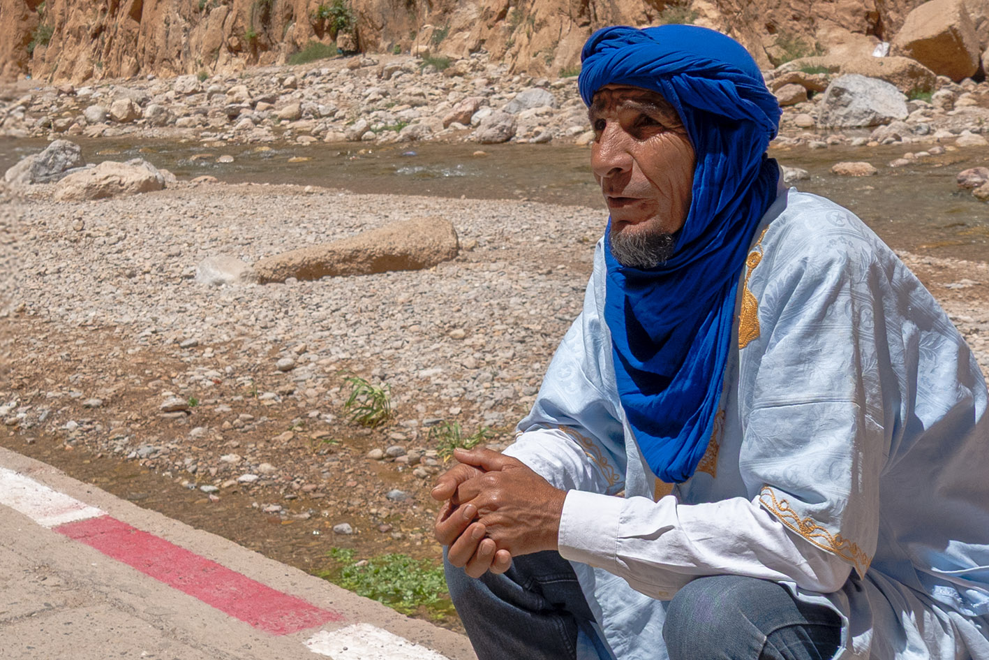 De rivier Dadès brengt water en vruchtbare aarde in het verder dorre landschap. Let op de verbrande palmen: zodra er termieten worden gezien in een boom, wordt de boom verbrand in de hoop de termieten te doden, maar de palm en het hout intact te laten