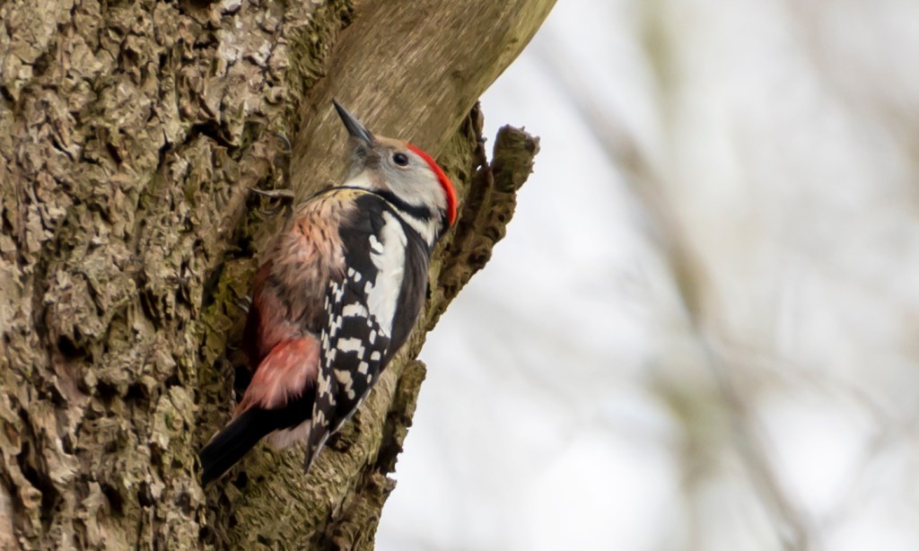 De zonsopkomst en de krokussen spreken voor zich. Maar wat doet die vogel erbij? Het is de middelste bonte specht – een tikje kleiner dan de heel algemene grote bonte, en fors groter dan de kleine bonte specht. Altijd goed herkenbaar aan zijn rode petje en zijn bleke snoet. Behalve aan het eind van de zomer wanneer de jonge grote bonte spechten uitvliegen, want die lijken er verdraaid veel op. Elk jaar stijgt dan ook rond die tijd het aantal waarnemingen van de ‘middelste bonte specht’ spectaculair.