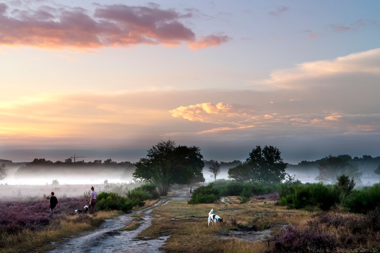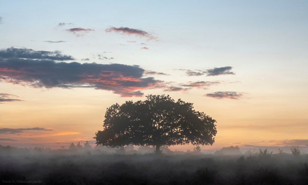 Op sommige plekken veroorzaakte het stof fraaie rode zonsopkomsten en – ondergangen. Hier op de Hoorneboegse heide was de hemel een kwartiertje vóór zonsopkomst op zijn mooist. Maar ook zonder rood is het een apart gezicht: dat bleke zonnetje in die grauwe sluier.