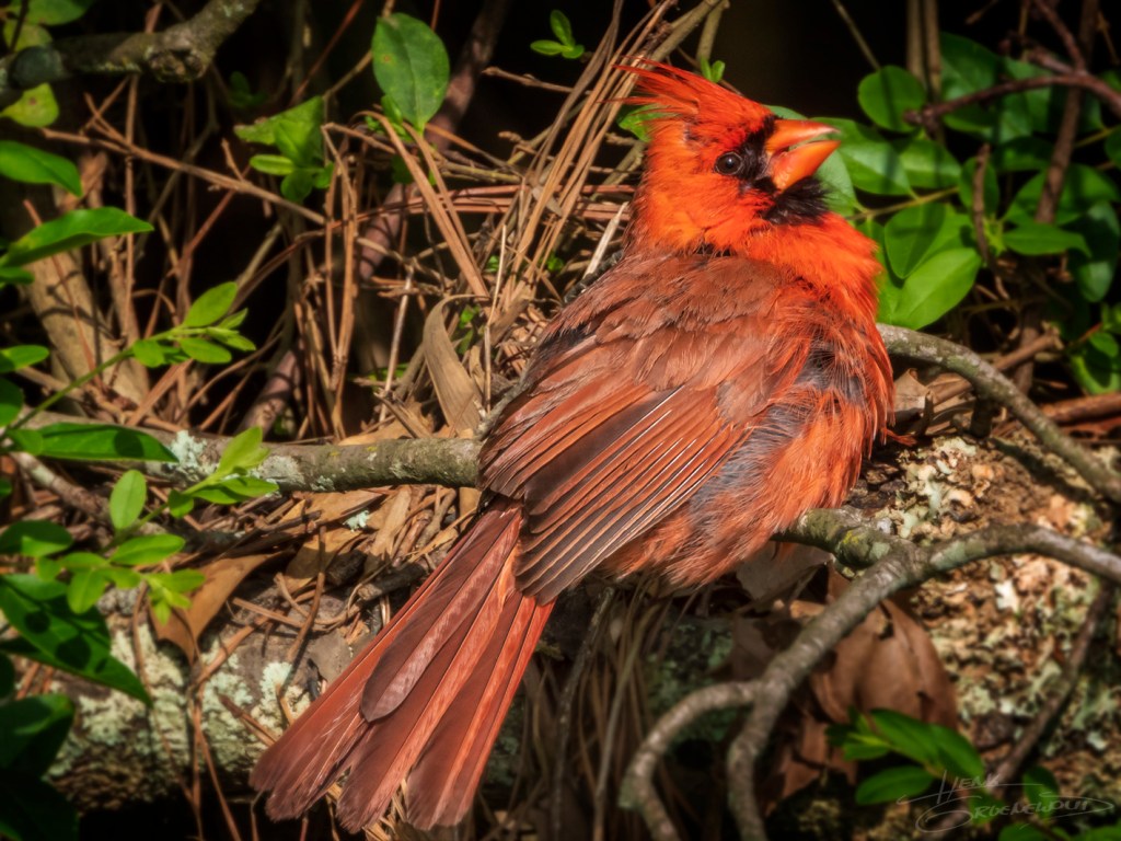 I woke up with birds singing, and they kept on singing all day long. You don’t need to go out to do birding, you can just sit on your veranda and they come to you. The intense red of the Northern cardinal (Cardinalis cardinalis) – just can’t stop taking pictures! I have them hunting for insects in the grass, singing and hiding in the bushes, but this one I like most: sunbathing in the scorching sun.