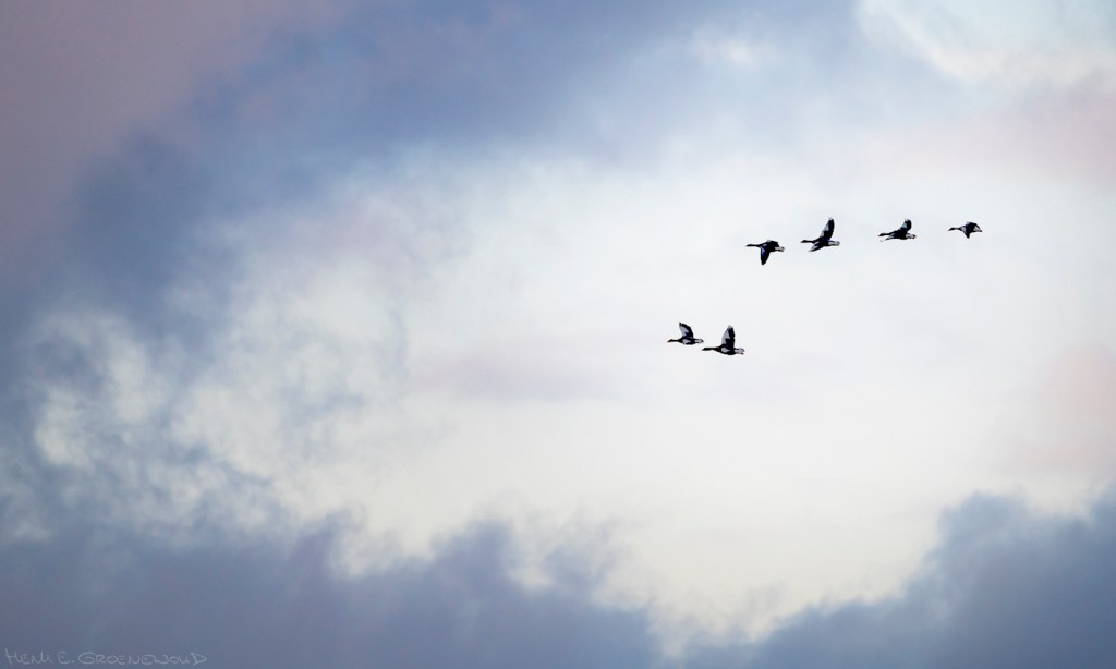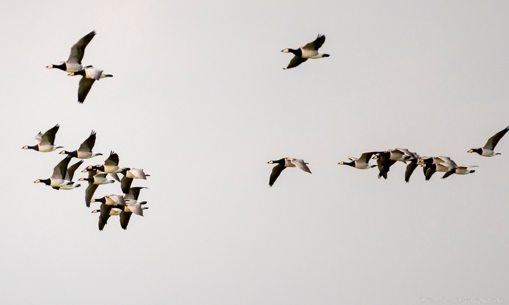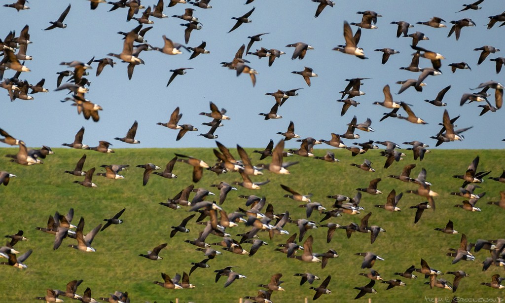 De brandganzen in vlucht. Mooi om te zien hoe de vogels als groep samen vliegen. Tijdens het vliegen gaan de koppen voortdurend naar links en rechts en naar boven en naar beneden: de omgeving wordt goed in de gaten gehouden. Aardig, maar niet bijzonder.