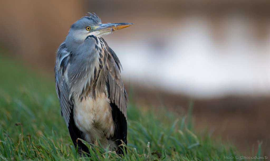 De reiger dan. Een portret. Technisch oké, maar eigenlijk een heel saaie foto. Er gebeurt gewoon niets. Het is een jonge vogel, met fletse kleuren. Als je goed kijkt, zie je dat hij er wat fluffy uitziet, zeker bij de poten. In de snavel zit een gat. Volgens mij gaat het niet goed met hem. Deze foto knaagt aan mij.