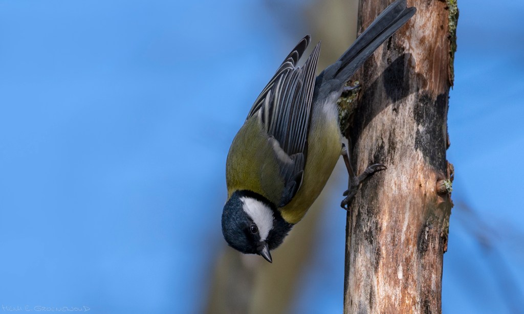 De koolmees: Prachtig hoe hij op zijn kop langs de stam hangt, als een specht stukjes bast lospikkend op zoek naar insecten. Het woord koolspecht kwam in me op. Alleen jammer van die ene tak op de achtergrond, die verpest het een beetje.