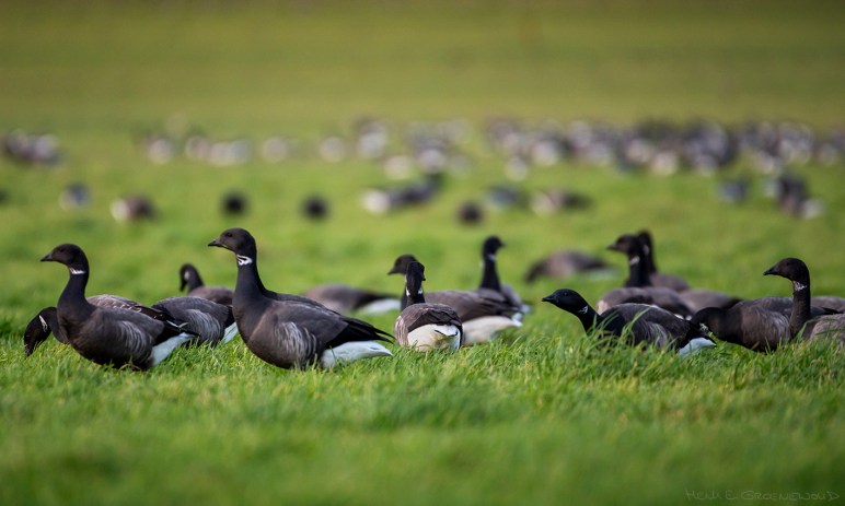 Allereerst de zaterdag, en ik begin met de rotganzen. Als ze grazen op het veld zoek je natuurlijk een lage positie, zodat de voor- en achtergrond onscherp worden en de vogels loskomen van de achtergrond. De lensopening gaat ook maximaal open om de onscherpte zo groot mogelijk te maken. Het liep al tegen zonsondergang, wat fijn is omdat het licht dan niet zo scherp is en de kleuren donkerder worden. Uit de hele serie heb ik er een gekozen waarbij een paar ganzen opkijken, want alleen grazende ganzen zijn saai.