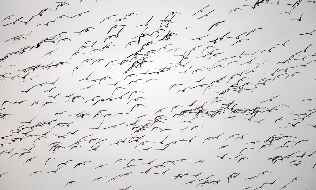 De hele club vloog op. Dat leverde een prachtig beeld op van ‘biomassaliteit’. Geen punten voor wie de meeste vogels op de foto zet overigens. Van het vliegen heb ik vele tientallen foto’s genomen en ik zou ze wel allemaal in detail willen laten zien. Prachtig, er gebeurt zoveel in zo’n groep! Bij het rondvliegen vloeien de vormen in elkaar over. Eén van de leukste foto’s vind ik die hieronder waarbij je bijna niets ziet, alleen maar ‘kriebeltjes’ in de lucht. Vogels zoals op kindertekeningen.
