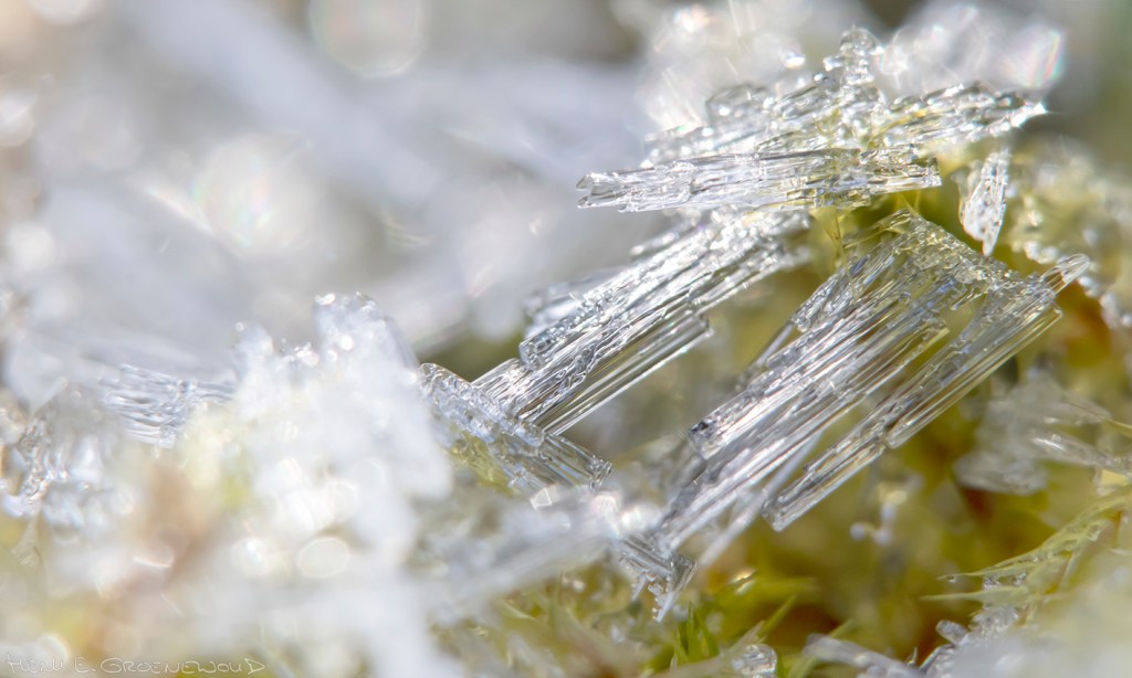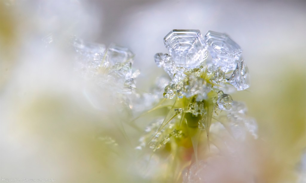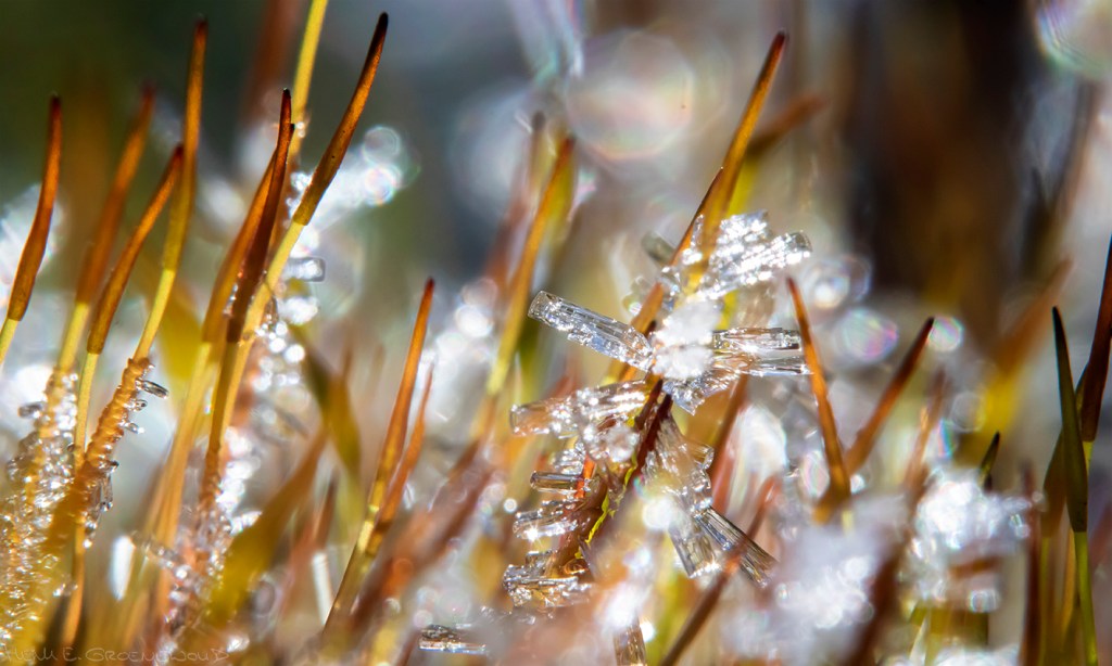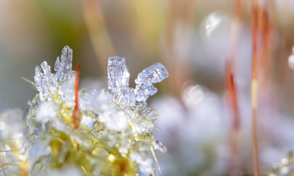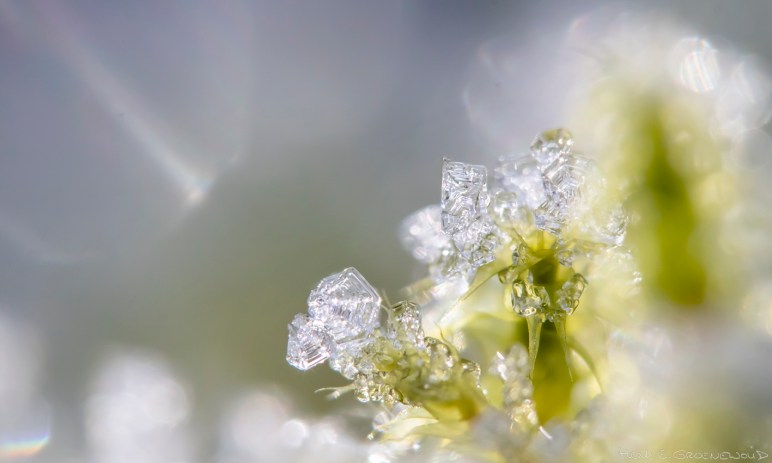 Een week geleden hadden we nachtvorst. Morgen lachen we daarom, als sneeuwstorm Darcy over het land giert, maar vorige week was dat nog heel wat. Tussen twee foto-opdrachten door had ik even gelegenheid om plat op de buik te gaan liggen en het witte laagje in detail vast te leggen.