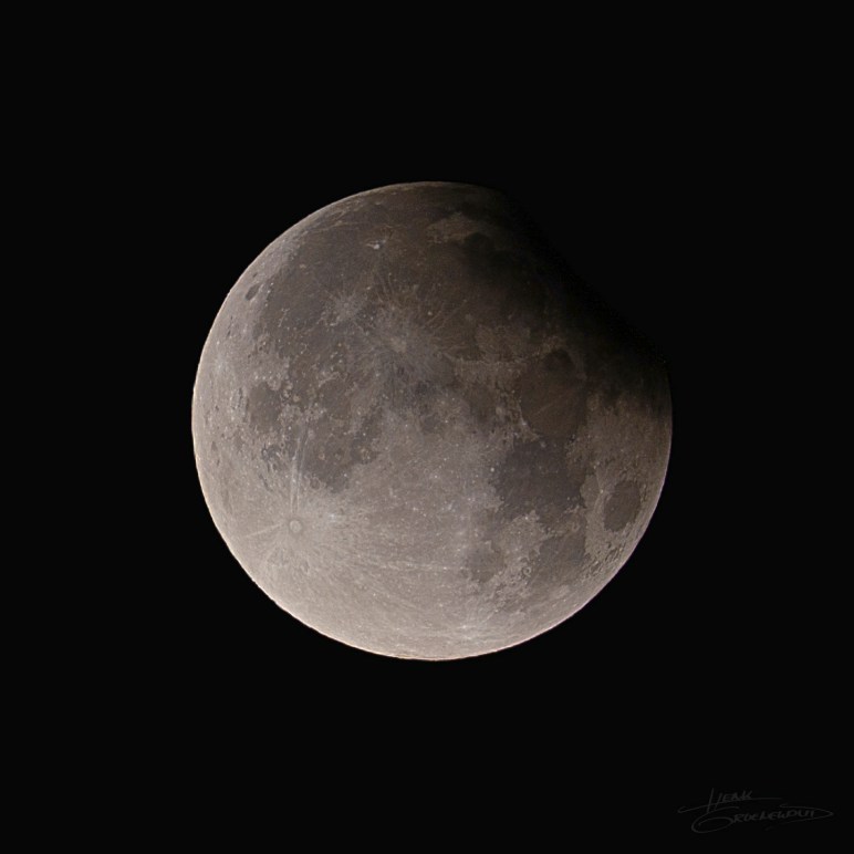 Hoe zullen we die gedeeltelijke maansverduistering dan noemen? De schaduw van de Aarde raakte de Maan maar nét, slechts een klein hapje werd er uit de bol genomen. Een kusje van de schaduw van de Aarde, dat lijkt me wel aardig.