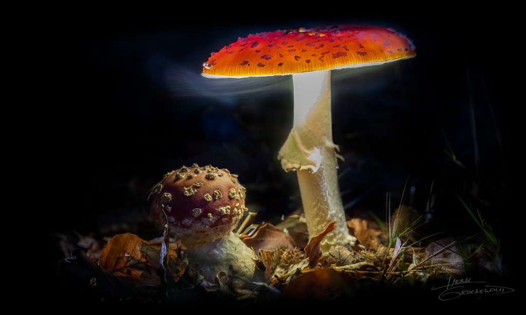 I didn’t go back until two days later. And what I hoped for, succeeded this time: catching the spores being spread by the fly agaric. There is a lot of Photoshop in this photo, but the spores are really real! Wonderful to experience the magic of the forest this way.