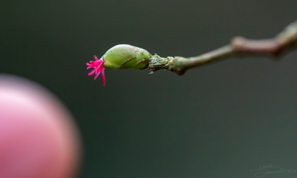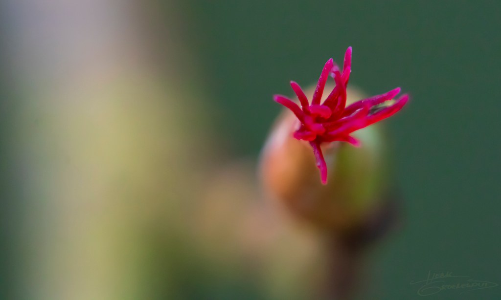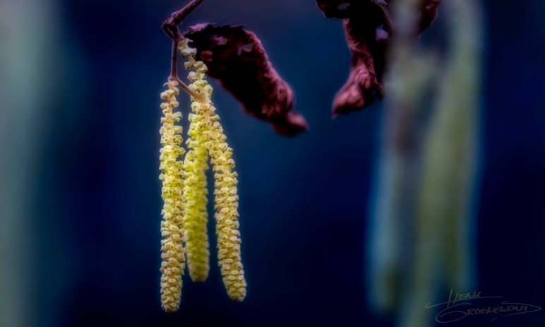 Eind januari, en de hazelaars staan in volle bloei. De katjes strooien het stuifmeel rond. Als je goed kijkt, dan zie je op sommige takken ook heel kleine rode puntjes, slechts een millimeter groot (ter vergelijking zie je mijn vingertop). Het zijn de bloempjes die het stuifmeel opvangen, om zich later te ontwikkelen tot hazelnoten.