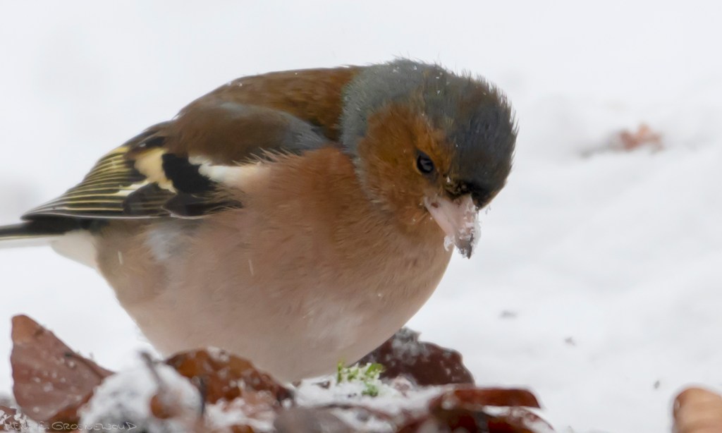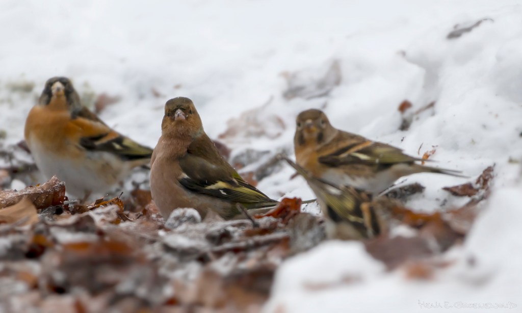 Tijdens een wandeling in Einde Gooi stond ik versteld van de enorme hoeveelheid vinken die opeens langs het pad in de sneeuw groeven. Het moeten er tegen de honderd zijn geweest, in kleine groepjes, af en toe vergezeld van kepen, koperwieken en een enkele koolmees. Pas na een tijdje zag ik dat ze beukennootjes zochten. Af en toe was het prijs, en vloog de gelukkige vogel even weg om zich tegoed te doen. Opvallend ook dat een paar eerstejaars vinken en kepen vooral leken toe te kijken hoe de oudere dieren aan het graven waren.